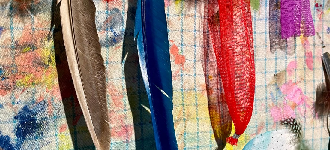 In mijn ‘schilderij’ heb ik letterlijk ook de verleden tijd meegenomen door op een oude theedoek te gaan werken, die ik al een hele lange tijd in mijn bezit heb en die uiteindelijk in mijn atelier terecht is gekomen als verfdoek. Nu is het dus de drager geworden van mijn compositie, vermengt met nieuwe restmaterialen, zoals de gesmolten fruitnetjes. Samengebracht zijn de elementen, zoals de fruit achtige vormen en het houten frame, de veertjes en persoonlijke bewaarde objecten (lepel en kwast) in staat een interpretatie geven op de werken van ‘Loki’ en is het ook persoonlijk werk geworden met mijn handschrift er in.