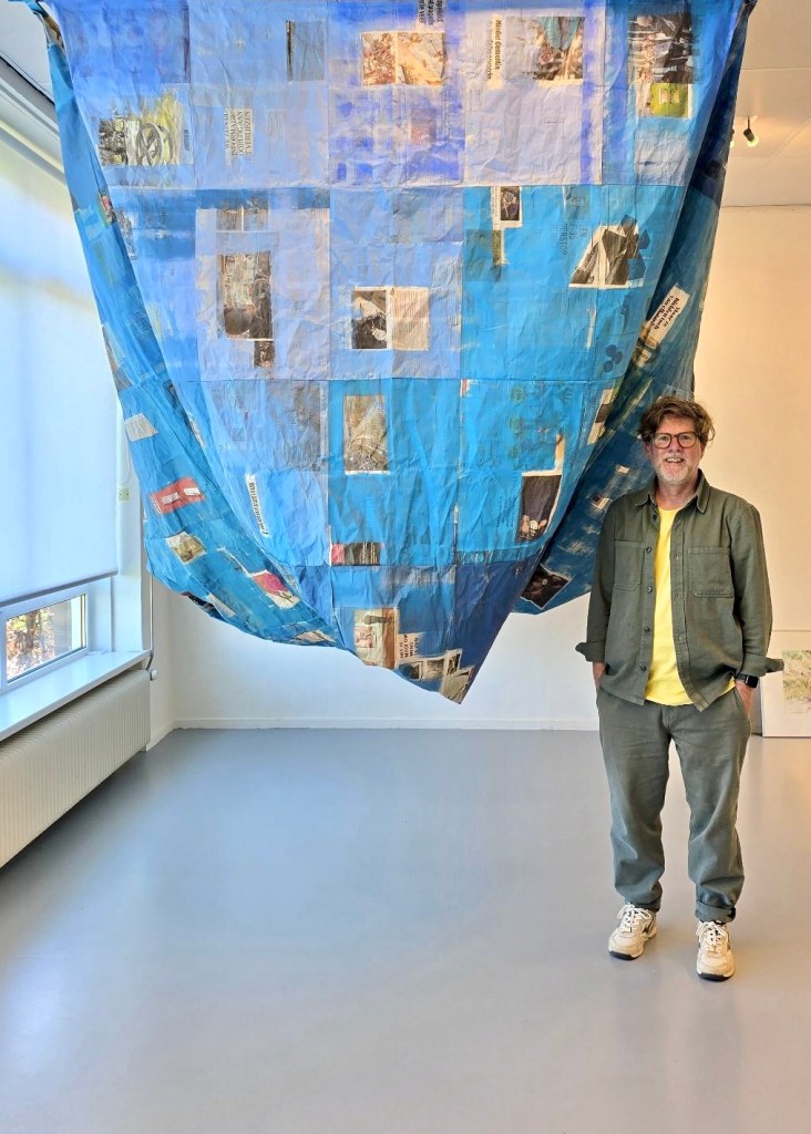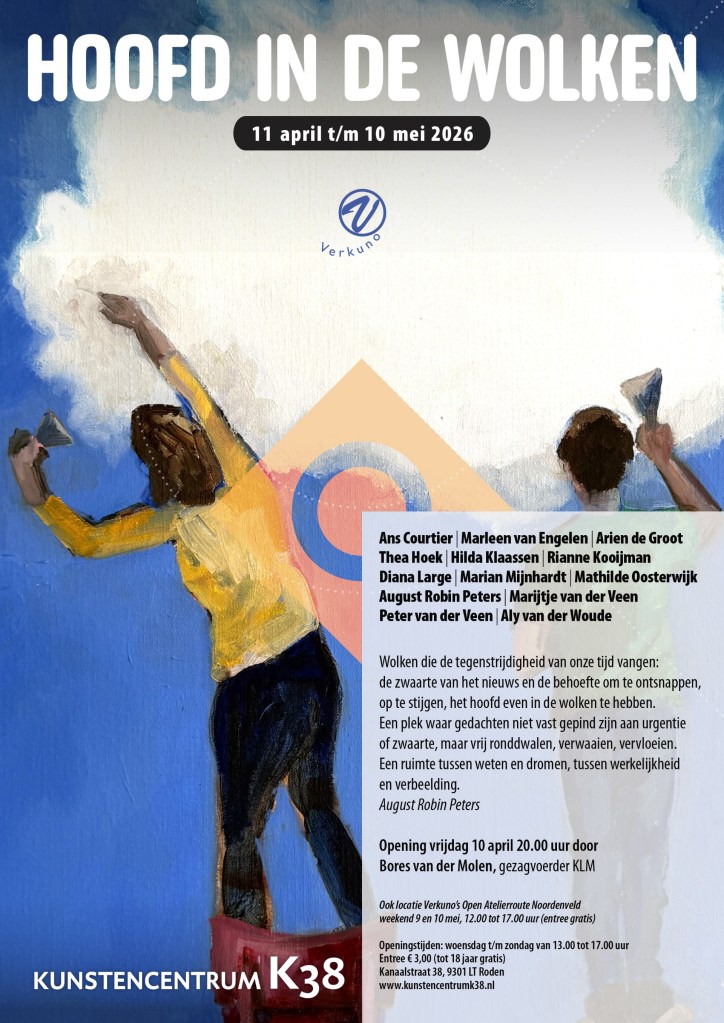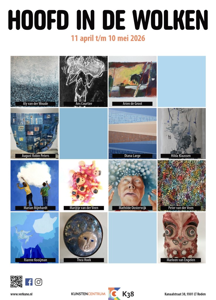 In kunstencentrum K38 is vanaf zaterdag 11 april de expositie ‘Hoofd in de wolken’ te zien. Georganiseerd door Verkuno. Deelnemende kunstenaars van dit collectief zijn gevraagd een reflectie te geven op dit thema en enkele gast kunstenaars zijn middels een open call geselecteerd om mee te doen. Mijn hangende papieren sculptuur ‘News cloud’ (2025) werd geselecteerd en is daar te midden van alle andere werken te zien tot en met 10 mei 2026. Kanaalstraat 38, Roden.