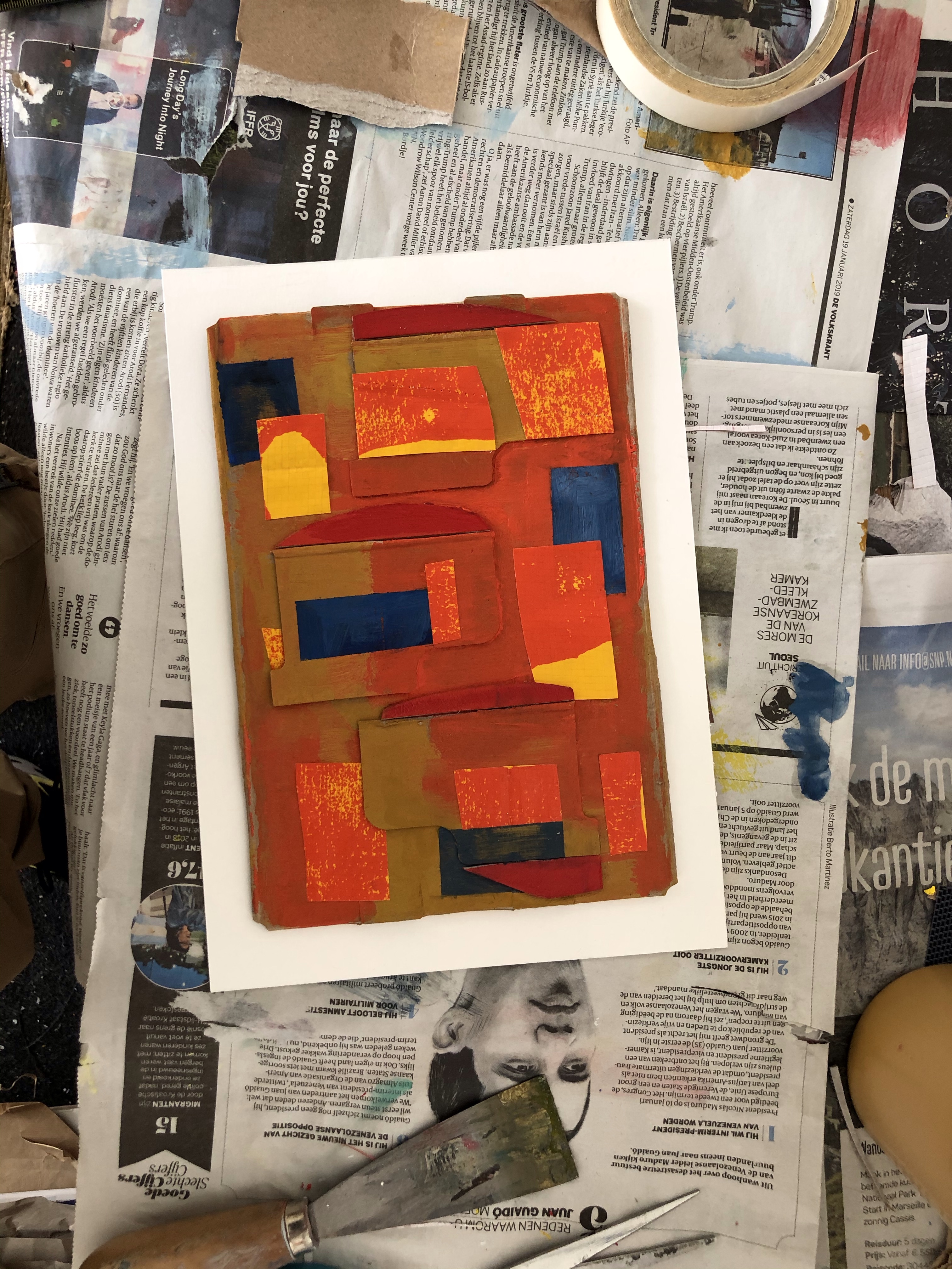 This small framed painting is nummer 22 from the series, made with a de-folded cardboard packaging box. The work sizes 16 x 22cm and the wooden frame is 20 x 28 cm and comes with anti-glared glass. The collage contains pieces of a polyurethaan grocery bag and pieces of cardboard molded om the surface with paint used as glue. The image is build up harmoniously in different stages and can be turned all four sides, upside down, any which way you like it best. In the spirit of #artistsupportpledge, I can offer this small work for sale at a price of 150,- incl.