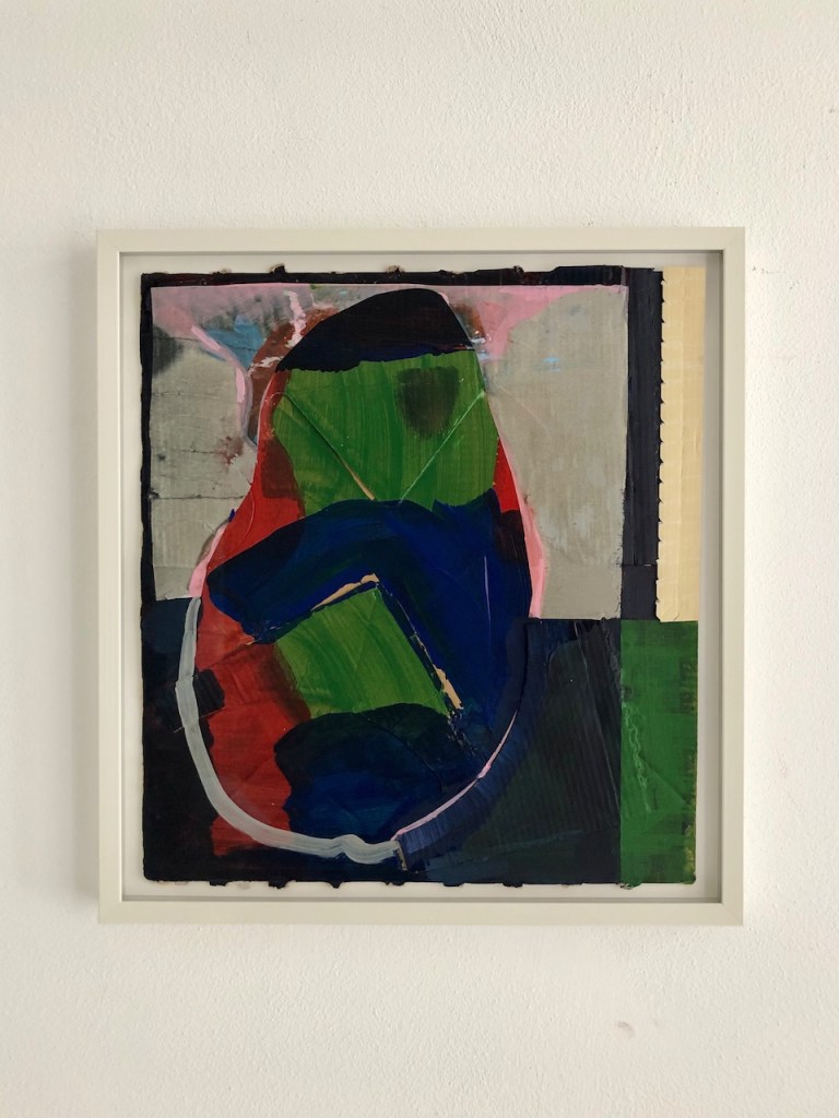 Collage made of bits and pieces of older work combined with new parts, some used materials are: Vinyl from my earlier atelier floor, tear-out parts of a painting on paper, cut-out piece of a painted canvas, pink wooden part from a children’s toy, found on the street.