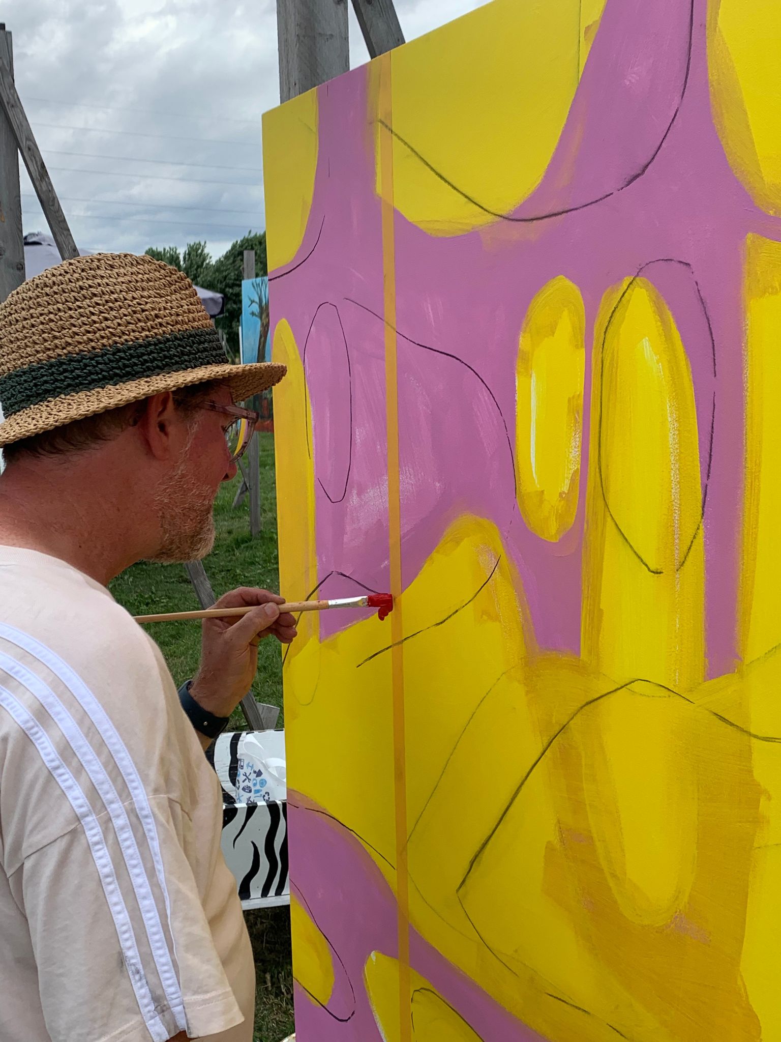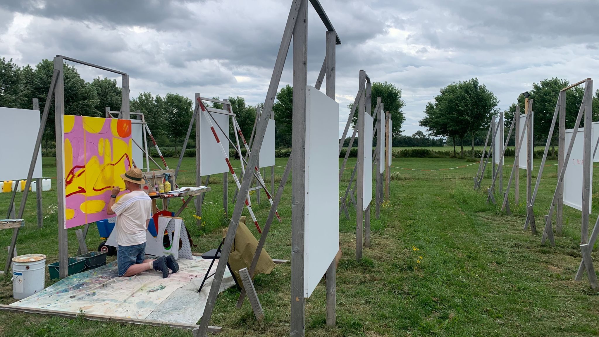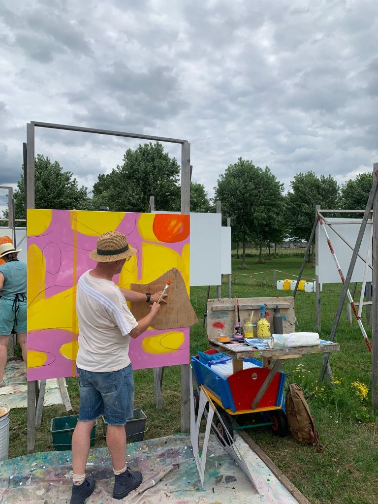 The challenge: create a painting on a wooden panel sized 1.22×1.22m in one day in the open air with provided paint. Wooden panel is screwed onto a frame and is adjusted to personal height.