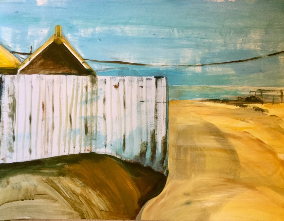 Here are more of my studies on how to compose a dune landscape with just one image as a basis. I tried different approaches in painting, drawing, using pieces of newspaper, tape. Using different colors. Most of the works have several layers and became a landscape over a period of 2 months of making decisions of what to keep in the picture and what not. The painting on canvas in orange and yellow became a 2 piece work with an extension of a boxing glove as an element of a imaginary part of a landscape. Will be continued…