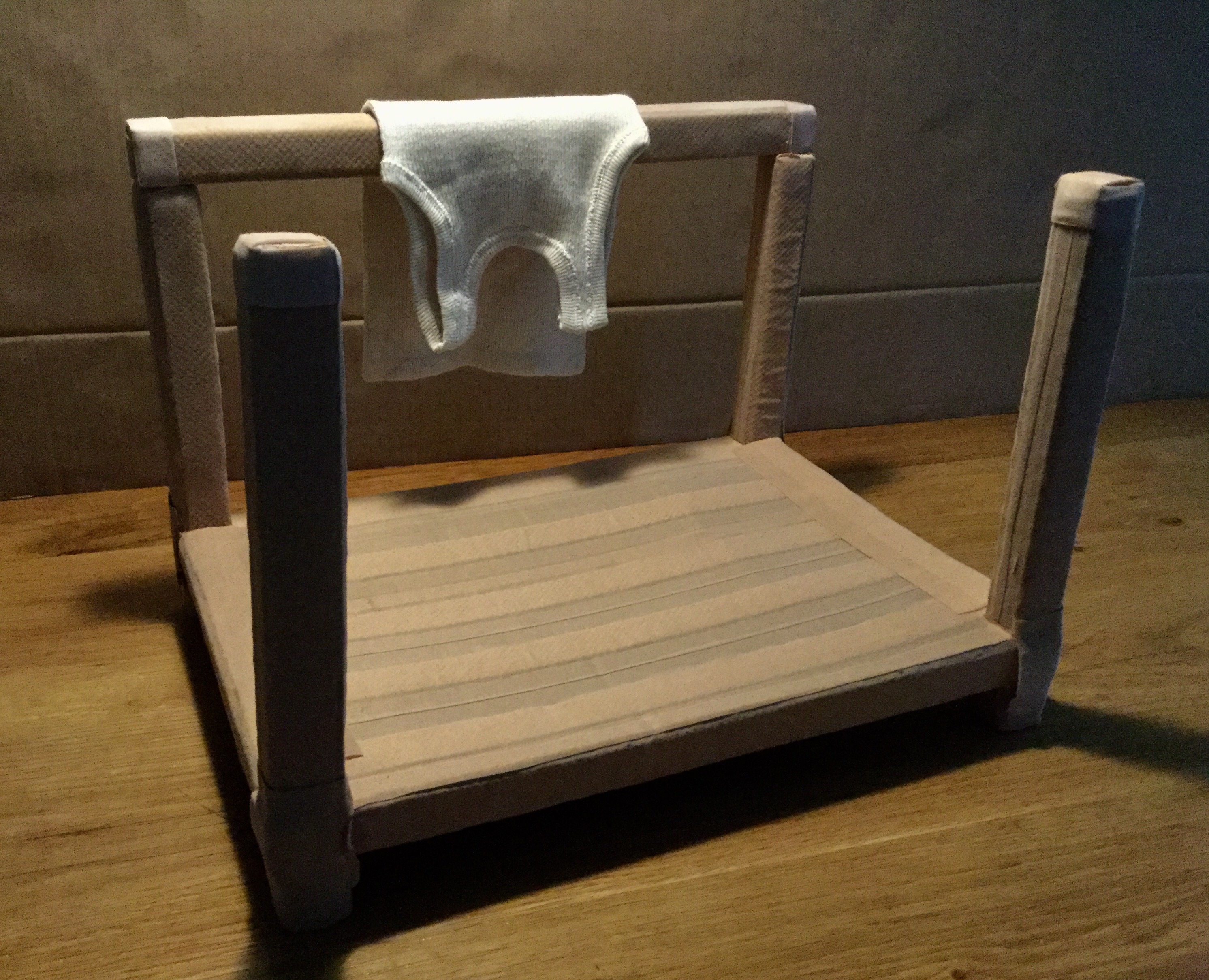 This short video is a study of the different possibilities of making a 3-dimensional work with the simple elements of a table. I was inspired by one of my favorite’s work by American artist Robert Gober ( play pen ) The pictures below show the maquette of the final form of the sculptural work. I choose to cover it with band aid, as a sort of skin to the geometrical attitude of the shape.