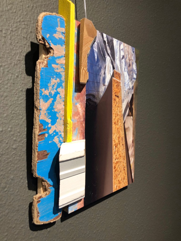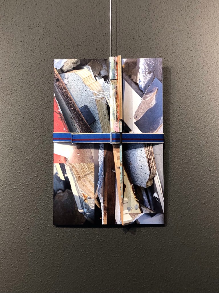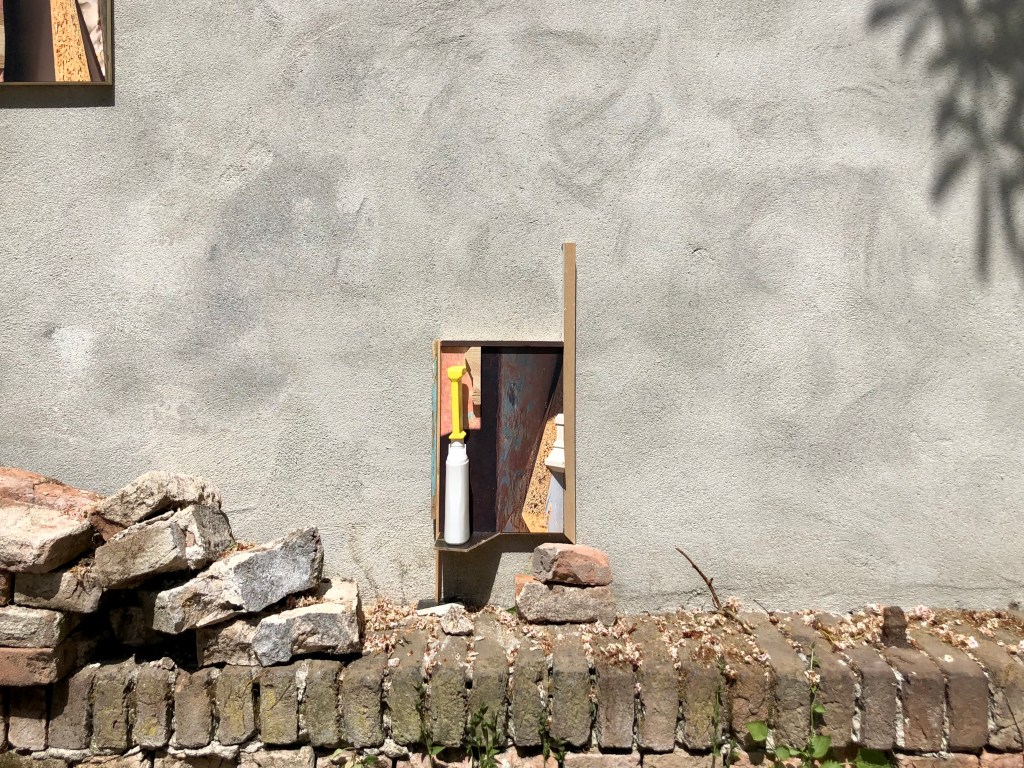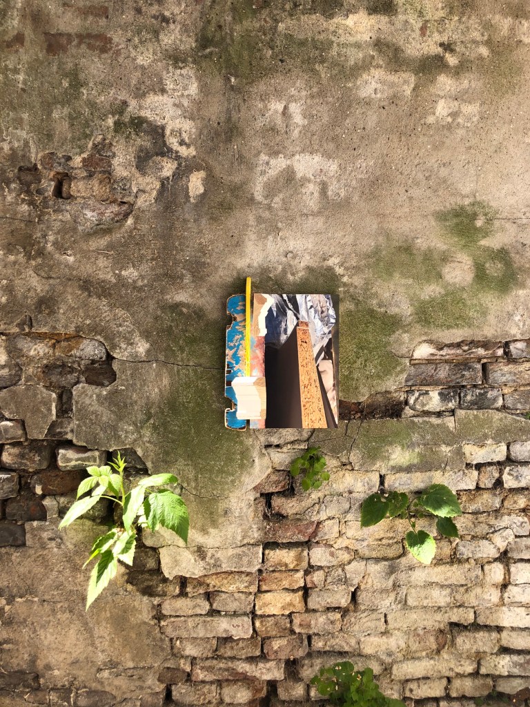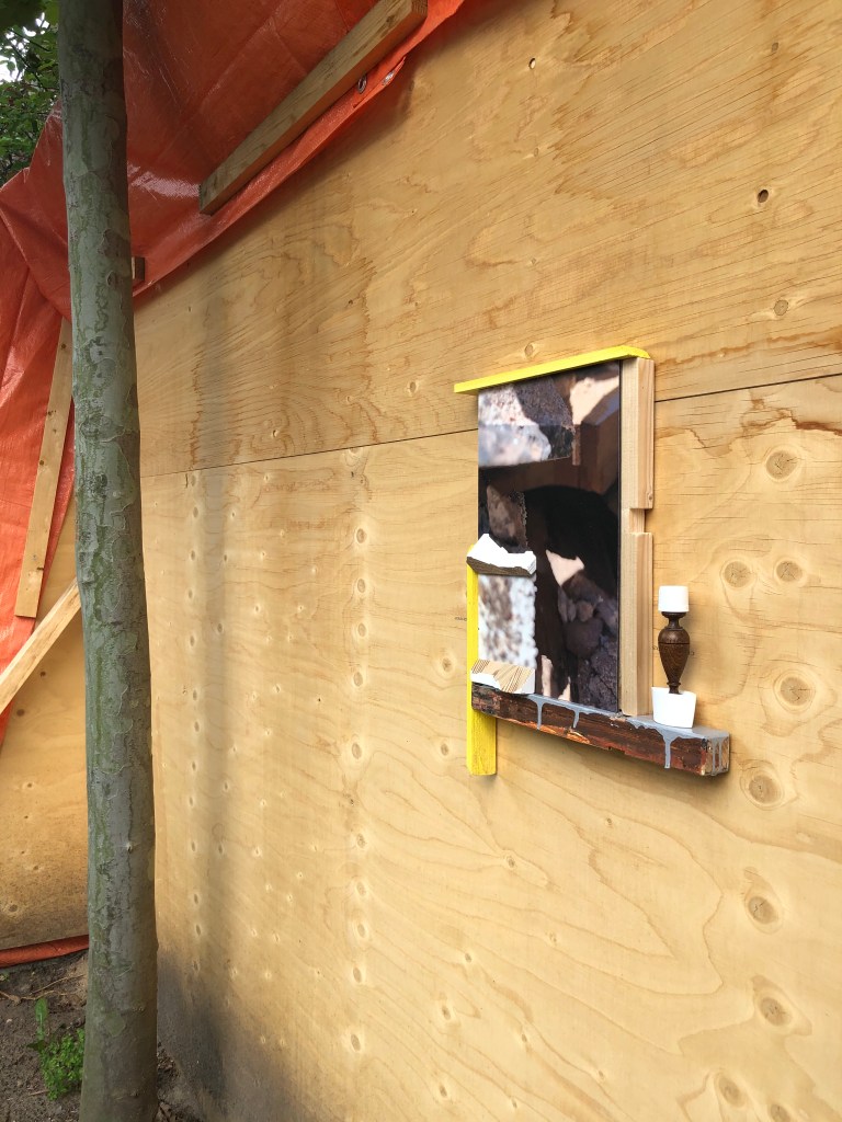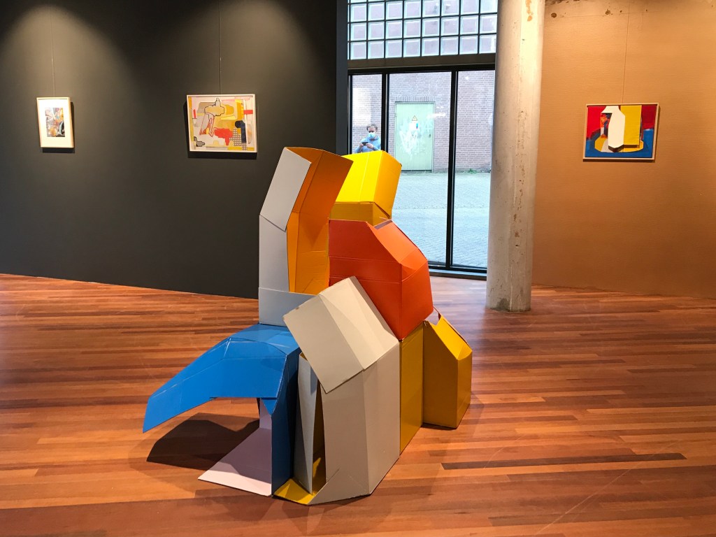 The idea and challenge for me was to make a sculptural work in a experimental setting, which had to have the right size for the space provided. The starting point for me was to go from a 2 dimensional work into a 3 dimensional installation. Using my materials like cardboard and newspaper, wood and paint in the same collage-like way as I do in my normaly smaller sized works.