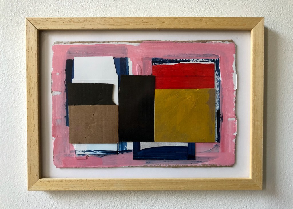 Collage made of bits and pieces of older work combined with new parts, some used materials are: Vinyl from my earlier atelier floor, tear-out parts of a painting on paper, cut-out piece of a painted canvas, pink wooden part from a children’s toy, found on the street.
