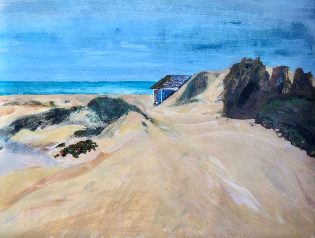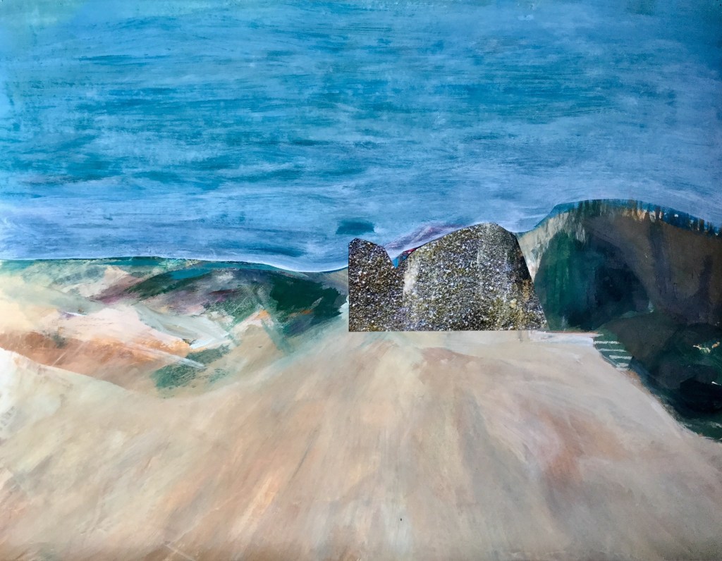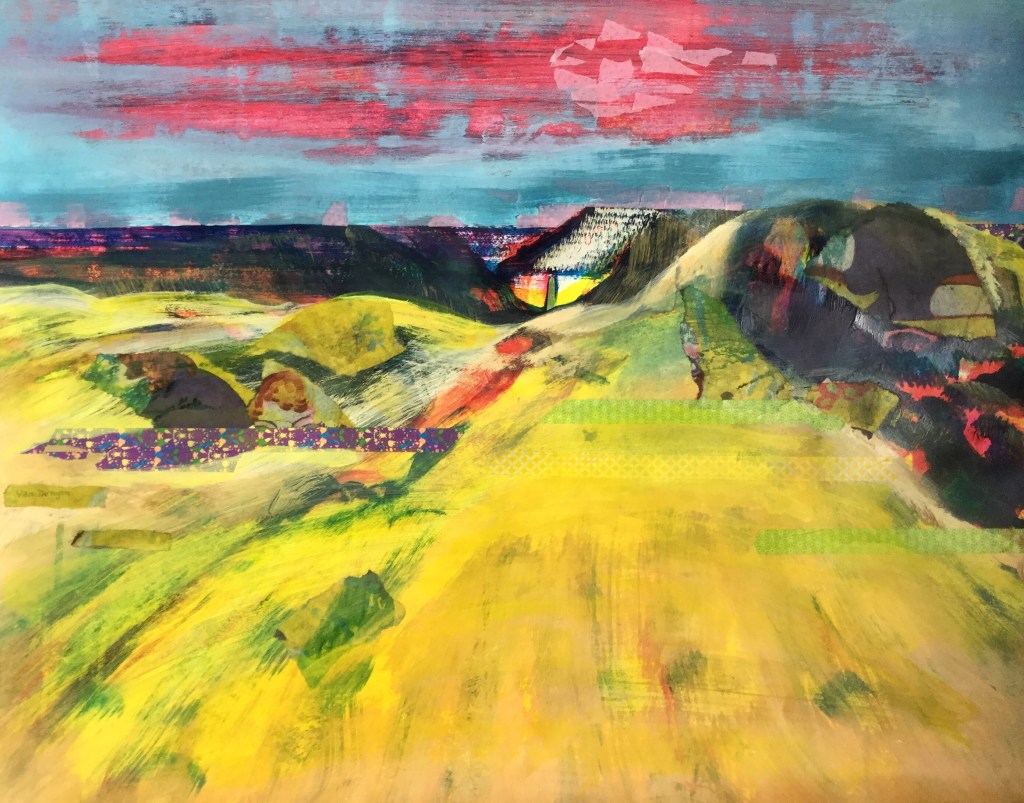 Geen categorieHere are more of my studies on how to compose a dune landscape with just one image as a basis. I tried different approaches in painting, drawing, using pieces of newspaper, tape. Using different colors. Most of the works have several layers and became a landscape over a period of 2 months of making decisions of what to keep in the picture and what not. The painting on canvas in orange and yellow became a 2 piece work with an extension of a boxing glove as an element of a imaginary part of a landscape. Will be continued…