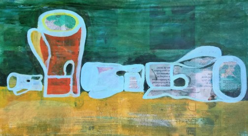 Rests-space take an important role, as you can see in the most abstract version painted on wood. The forms become more important and with less details. Beside the fact that they change form and become something on their own. The originally tea boxes and other packaging material also become an interesting form to look at. On one hand they are flat and have, at the same time the illusion of a dimensional form. The playing between flat and non flat keeps me occupied and fascinated.