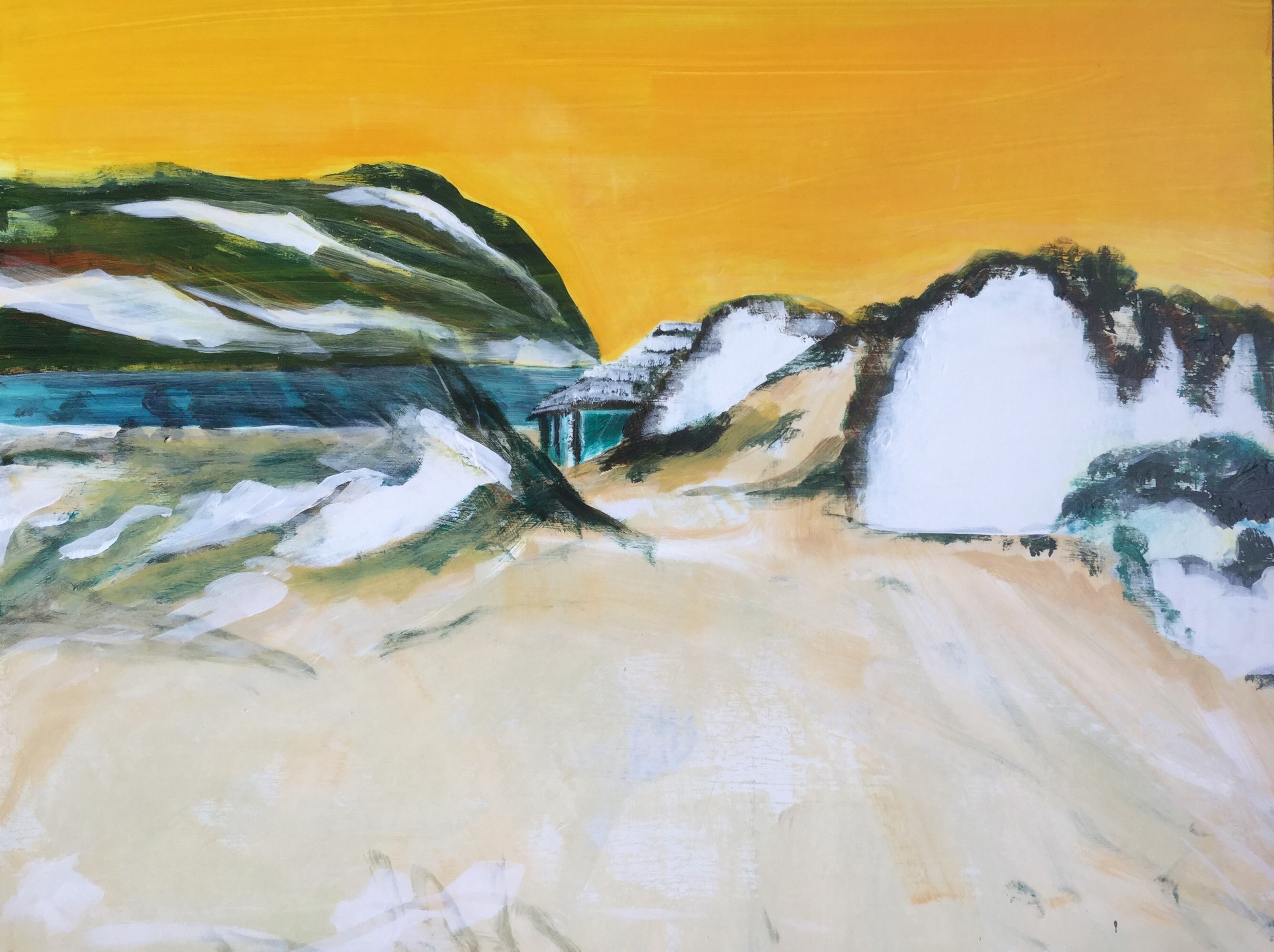 Here are more of my studies on how to compose a dune landscape with just one image as a basis. I tried different approaches in painting, drawing, using pieces of newspaper, tape. Using different colors. Most of the works have several layers and became a landscape over a period of 2 months of making decisions of what to keep in the picture and what not. The painting on canvas in orange and yellow became a 2 piece work with an extension of a boxing glove as an element of a imaginary part of a landscape. Will be continued…