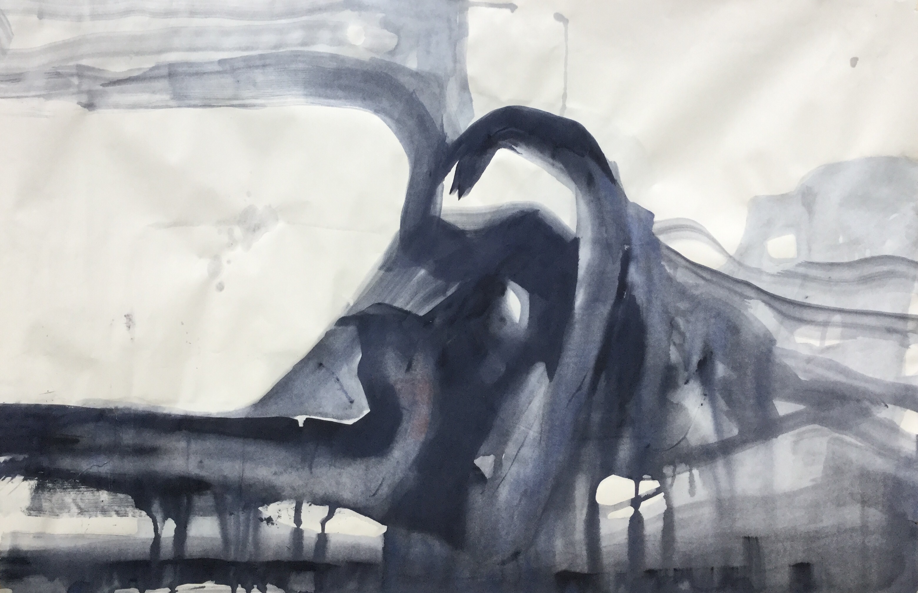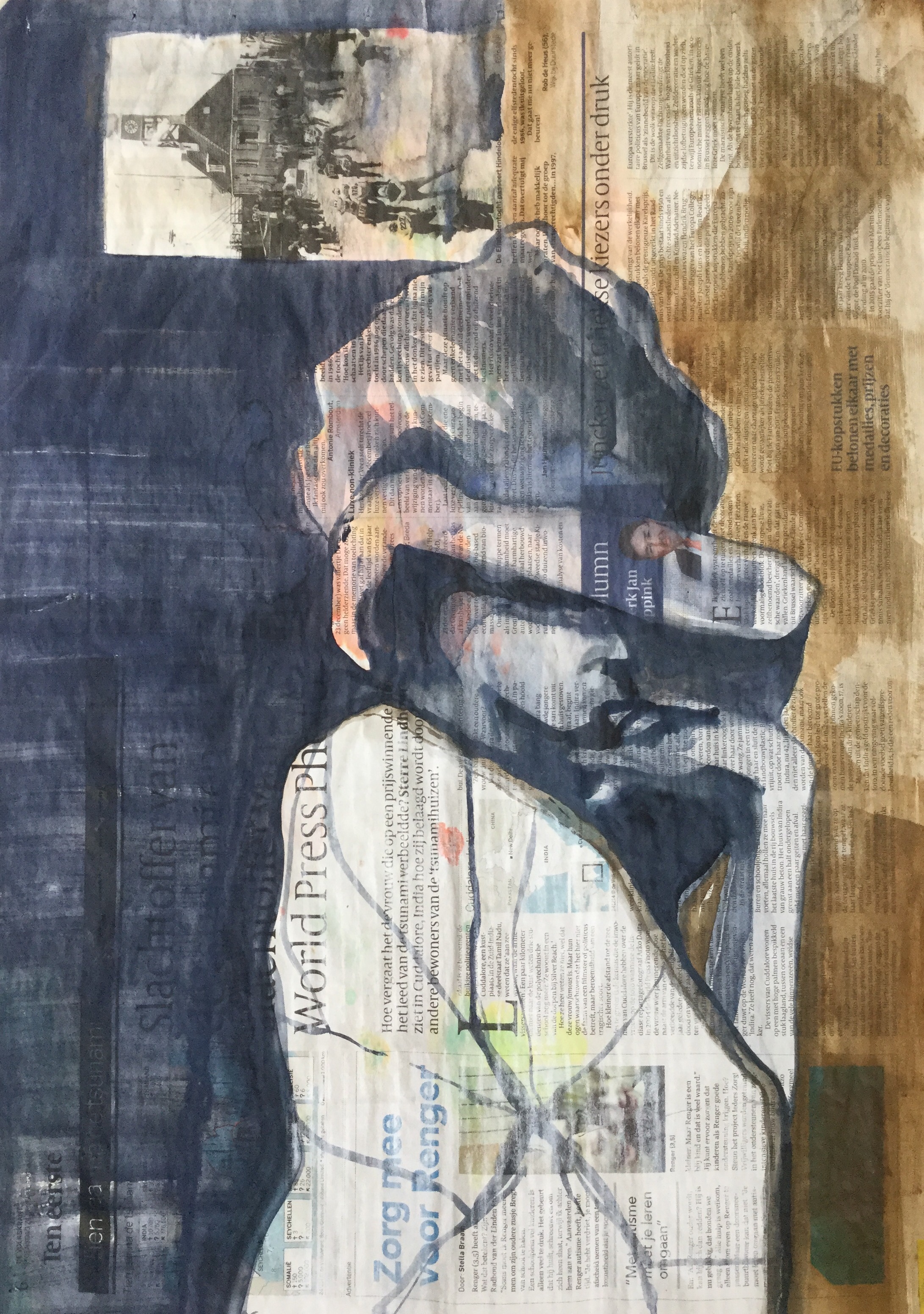 A process of making spots, stains with ecoline and tearing, sewing newspaper, photo’s. Combinig, placing, replacing, attaching. From a blanc tablecloth paper ( appr. 100cm x 140cm ) to creating a new image of a place i’ve never been before.